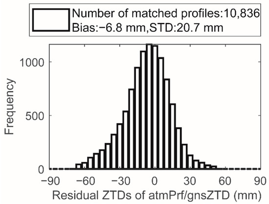 The global distribution map of generated matched dataset introduced in Section 2 is shown in Figure 4, where the color indicates the horizontal distance () between the lowest point of each occultation profile and the GPS observation station. To verify the consistency of ZTDs from occultation data and the ground based GNSS, a filter of a horizontal distance of 300 km and a vertical distance of 1 km was reused for the statistics of the differences between GNSS-ZTD and RO ZTD. Figure 5 shows the statistical diagram of the difference between the matched data of occZTD and gnsZTD. Similar to the data preprocessing of occZTD and sonZTD, we removed the unreliable occZTD and gnsZTD data pairs by the 3 sigma principle. includes 24,278 statistical points normally distributed (bias is −4.6 mm; standard deviation is 20.5 mm), but the bias and standard deviation are higher than those of or . Although the ZTD of the solution from the ground based GNSS station has been greatly improved after correction, the ZTD is still very sensitive to the vertical distance () between the lowest point of each occultation profile and the GPS observation station, which is discussed in the following subsection.