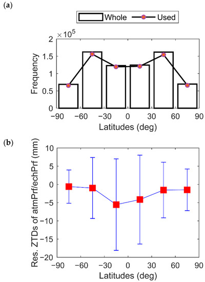 The ECMWF model has better accuracy in the Northern Hemisphere than in the Southern Hemisphere [29,30]. The ZTD is affected by temperature, which has a strong relationship with latitude. To this end, we calculated the accuracy of in different latitude regions. Figure 6a shows the total amount of data in each region and the amount of data involved in the statistics after deducing the gross error (3 sigmas principle). The occultation data are evenly distributed in the Northern and Southern Hemispheres and are mainly concentrated in the middle and low latitudes (approximately 80%). Figure 6b shows the trend of with latitude. In the northern and southern high-latitude areas (latitudes greater than 60°), due to the low temperature and low water vapor content, the bias and standard deviation of are extremely small, and their absolute values are all less than 5 mm. As the latitude decreases, the temperature and water vapor content increase, causing the ZTD error to increase. In particular, the standard deviation near the equator reaches more than 12 mm. In addition, the bias of the ZTD in the northern equatorial region is slightly smaller than that in the southern equatorial region, which verifies that the Northern Hemisphere ECMWF model can match the occultation observation data better than the Southern Hemisphere model.