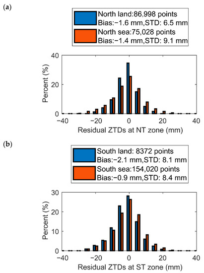 Statistics and distribution of residual ZTDs of atmPrf and echPrf in 2008 in (a) the south temperate (ST) zone; and (b) the north temperate (NT) zone. Blue indicates land and red indicates sea.