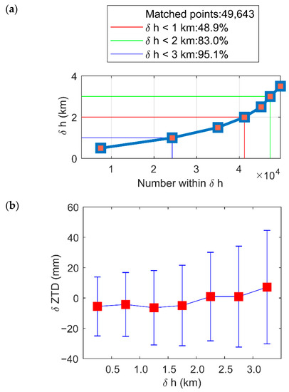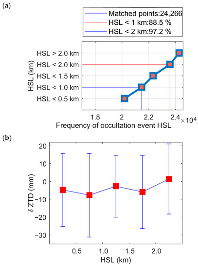 To analyze the effect of the error caused by the inconsistency in the vertical height between the lowest point of the occultation profile and the ground station, obtained by a filter with a horizontal distance of 300 km was analyzed. Figure 8a shows the number of occultation observations and the height difference () between the lowest level of matched RO profiles and GNSS stations. It can be seen from Figure 8a that because COSMIC uses open-loop data tracking, the percent of with the within 1 km reaches 48.9%, and that with the within 3 km reaches more than 90%. Figure 8b shows the statistical precision of different s. Because ZTD is sensitive to , when is in the range of (0.0,3.0) km, its standard deviation increases.