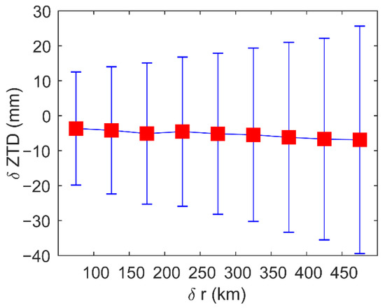 ’s variations in residual ZTDs of matched atmPrf and gnsZTD in 2008. Red square mark biases of residual ZTDs of matched atmPrf and gnsZTD in ranges, and blue error bars in y-axis indicate STDs. Red circles marked the location of the x-axis ticks.