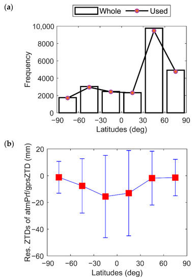 HSL variations in (a) frequency; and (b) residual ZTDs of matched atmPrf and gnsZTD in 2008.
