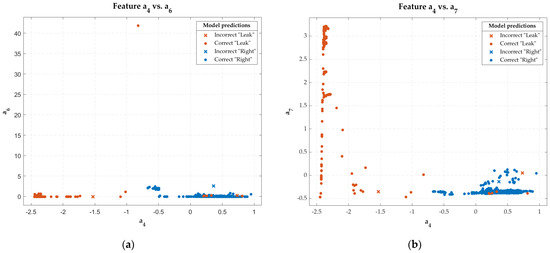 Regarding the models obtained, it can be said that the algorithms that performed best from highest to lowest performance for balloon cavities were medium tree, neural networks, and quadratic discriminant. Furthermore, most of the interclass discriminating power, regardless of the algorithm, was concentrated in the features a4, a6, and a7 (see Table 5). It was observed that the combination of a4 with a6 and a7 gave high discriminatory power, as the cases of different classes tend to be grouped, except for some cases of “Leak” that were embedded within the cluster of cases of the “Right” class. However, a4 and a7 did not have such a clear separation of cases and tended to intermingle to a greater extent (see Figure 8).