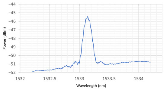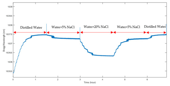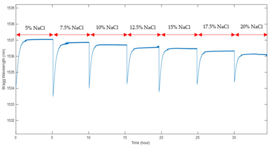 Figure 12 shows that the recorded wavelengths are consistent for the same value of NaCl (5%). Using the average wavelength measurement over the last 10 min recorded in each phase of the experiment, the difference between the two measurements at 5% NaCl solution was 15 pm, whilst for pure distilled water it was 2.5 pm. These extremely small differences confirm the repeatability of the sensing process and probably mainly arise due to the temperature variation in the solution over the period of the experiment (about 7 h).