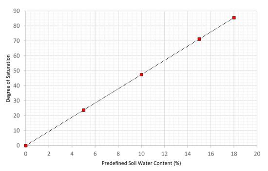 The experiments were carried out at 5, 10 and 15% soil water content (SWC) with different salinity concentrations. These specific values of soil water content were selected because the samples were compacted up to near saturation condition [23]. The degree of saturation for the samples with different values of water content was calculated by Equation (5), a well-known formulation in soil mechanics [44]: