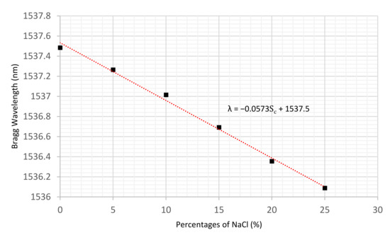 It can be observed that there is a linear relationship between NaCl percentage concentration and the sensor’s wavelength which can be expressed by Equation (6):