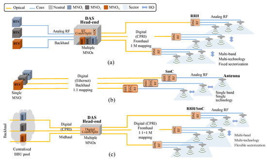 Typically, DAS systems are designed with multi-tenancy support in mind, where many DAS deployments start with a single MNO tenant, and more MNOs are added to the system later on. Thus, it is essential to have a flexible sharing architecture that permits easy additions of MNOs with the ability to handle service and capacity changes. The recent move from legacy analog DAS to a newer breed capable of integrating digital baseband signals to be carried over FH links using the common public radio interface (CPRI) protocol, as illustrated in Figure 1a, has brought additional benefits with respect to efficient sharing such as flexible capacity sectorization and signal routing, dynamic capacity steering, automatic synchronization and delay compensation, and improved scalability. On the other hand, SmC systems have recently adopted the centralized radio access network (C-RAN) architecture and are available with RAN sharing options (i.e., the 3GPP-based multi-operator core network (MOCN) and gateway core network (GWCN) and the non-3GPP but widely used multi-operator RAN (MORAN) []). Hence, distinguishing SmC as a capacity-only solution and DAS as a coverage-only solution becomes even harder in the context of 5GB UDNs, where both are expected to expand their application scenarios by coming together in a single integrated solution utilizing the C-RAN architecture as depicted in Figure 1c.