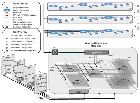 Within the virtualized neutral host comes the hypervisor, which decouples the physical network resources from the virtual networks to enable multiple tenant MNOs to share the same physical infrastructure, each with its own topology and addressing scheme. In addition, the hypervisor assumes the responsibility of defining the required virtual network functions (VNFs), VNF chaining, and the mapping of each tenant MNO to its chains of VNFs. An example is given in Figure 2 that considers a 100-story building with 10 sectors run by an IBO. Here, contracts with the IBO to provide 2G, 3G, and 4G access to specific antennas in different sectors of the building. Accordingly, the hypervisor instantiates and maps it to through the route as a BH signal given that has decided to utilize the vBBUs at the head-end. on the other hand, contracts for the same resources in addition to 5G access over a different set of antennas in different sectors and public safety access to cover the whole building. The hypervisor recognizes that has been already mapped to , and thus slices into and to be shared between the two MNOs. In addition, the hypervisor will instantiate a new for the 5G resource and for public safety and route the traffic of the , , and associated with back to its off-premise BBUs through as an FH signal. The hypervisor follows the same procedure whenever a new MNO is added or when the deployment plan of an already existing MNO incurs any modifications.