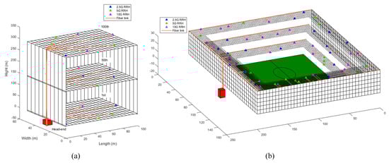 Deployment scenarios of the proposed 5GB neutral host architecture. (a) One-hundred-story commercial building. (b) Stadium.