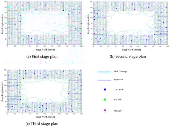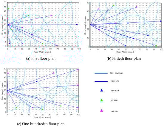 In this section, the efficiency of our proposed 5GB neutral host design architecture is examined in terms of the e2e delay and the amount of TCO reduction. For this, we used MATLAB to implement our proposed architecture for the design of a 5GB neutral host of two real-life deployment scenarios, namely a 100-story commercial building representing an indoor scenario and a stadium representing an outdoor scenario. In the first scenario, illustrated in Figure 3a, each floor of the 100-story building, which has an area of 100 × 60 , was partitioned with a granularity of 1 , RRHs with an FH capacity that could be either 2.5, 5, or 10 Gbps, and a coverage radius selected between 10 and 30 m randomly located over the floor plane until full coverage was achieved. Figure 4 gives an example of how the random distribution of RRHs was performed for the 1st, 50th, and 100th floors of the commercial building, which resulted in a total number of 1112 RRHs required to cover the whole building. For the second deployment scenario, depicted in Figure 3b, the stadium had an area of 200 × 160 and consisted of three stages. We followed the same procedure as in the first scenario to partition each stage and randomly distributed the RRHs as illustrated in Figure 5. However, in this case, we selected the radius for the coverage area of an RRH between 10 and 20 m to account for the fact that the density of mobile users at a stadium would be higher than that in a commercial building. Accordingly, the resulting total number of RRHs required to cover the stadium was 284.