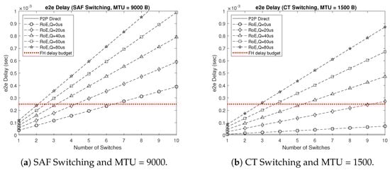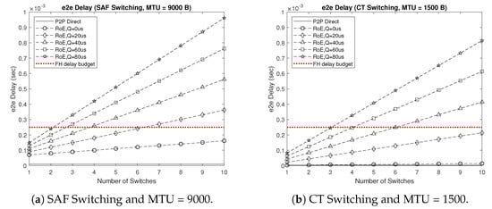 Figure 6 shows the e2e delay results of our proposed 5GB neutral host design architecture for the 100-story building deployment scenario depicted in Figure 3a. Here, we considered the worst case of using SAF switching and MTU = 9000 and the best case of relying on CT switching and setting MTU = 1500 instead. Comparing the results of the two cases, we first noticed the benefit of using CT switching with a smaller size MTU, which resulted in a performance comparable to that of P2P fronthauling, assuming no queuing delay. However, as soon as a queuing delay was introduced, we saw a drastic increase in the e2e delay, which limited the number of switches that could be accommodated in a switched RoE setup without violating the 250 μs delay budget to only three in the best case scenario, when the queuing delay was set as high as 80 μs. Figure 7 shows a higher e2e delay for the stadium deployment scenario resulting in further limiting the number of switches allowed along the FH route. This was evident from the results of both deployment scenarios in the worst case of SAF switching and MTU = 9000 with the assumption of no queuing delay, where accommodating more than ten switches was still possible in the commercial building scenario while maintaining the delay below 250 μs; whereas, it was limited to only six switches for the stadium scenario. This was mainly due to the increased average distance between the RRHs and BBUs in the stadium scenario compared to that of the commercial building. Hence, the utilization of switched RoE in the FH segment of our proposed 5GB neutral host architecture is in fact feasible as long as the queuing delay is kept to a minimum, which can be achieved based on 802.1Qbv traffic scheduling and 802.1Qbu frame preemption. With the merits of enabling a flexible functional split and reconfigurable FH, RoE represents an attractive deployment option as a replacement for the CPRI protocol.