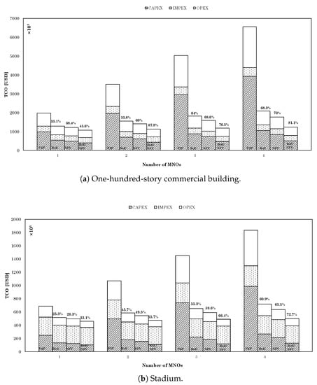 To investigate the cost effectiveness of our proposed 5GB neutral host design architecture, the amount of TCO reduction made possible by the utilization of RoE and NFV technologies was examined by conducting a comparison with the TCO resulting from the P2P fronthauling of C-RAN as a benchmark and that of RoE-only and NFV-only over the 100-story commercial building and the stadium deployment scenarios discussed earlier. To accomplish this, we relied on the formulation of TCO as expressed in Equation (3) with the notations used hereinafter summarized in Table 1 [,,].