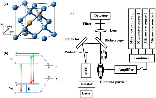 NV centers are crystalline imperfections in diamond lattices. An NV center consists of a nitrogen atom substituting for a carbon lattice site that is bound to an adjacent vacant lattice site, as shown in Figure 1a. The ground state and the excited state of an NV center at room temperature are both spin triplets with symmetric energy levels of 3A2 and 3E, there being metastable states 1A1 and 1E between the two, as shown in Figure 1b [2,17]. The spin-spin interaction of the two unpaired electrons in the ground state causes zero field splitting (ZFS) between the ms = 0 and ms = 1 states, and the splitting energy level D is approximately 2.87 GHz. The process of the 3E excited state returning to the 3A2 ground state is accompanied by the release of red-band fluorescence with a zero-phonon line at 637 nm. At the same time, the phonon sideband also emits fluorescence within the range of 637–800 nm. Based on the specific energy level transition rules of the NV center, the excitation laser polarizes the NV center electron spin into the ms = 0 state [18,19]. With the microwave magnetic field at an appropriate frequency, resonating with the electron spin, the fluorescence intensity emitted by different spin states will be different. By detecting the fluorescence change in the red-band wavelength region, the magnetic field can be sensed and measured [20].