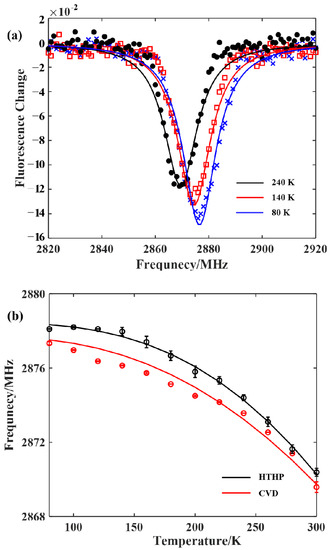 The temperature change experiment was performed on both the HTHP particles and the bulk CVD samples to obtain the corresponding temperature-sensitive rules. The resonance frequency of the NV centers for zero magnetic field was extracted, as shown in Figure 2b. The experimental results for the HTHP samples at the same temperature had larger errors than those for CVD samples, but the overall trend of the ZFS energy D with temperature was essentially the same. Referring to the previous research, the following formula was adopted to fit the experimental results of the ZFS energy D with temperature, as shown in the solid lines in Figure 2b.