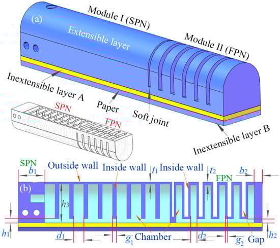 The structure of the newly proposed soft actuator is illustrated schematically in Figure 1a. Different from the conventional soft pneumatic actuator which often has only a single pneumatic network form, the proposed one consists of two typical pneumatic networks (extensible layers) connecting in series through two inextensible layers with an inextensible paper inserted in between. The main body of the soft actuator has a total length of 119 mm and a width of 20 mm. A sectional view of the main body is shown in Figure 1b, and the internal structure and chamber distribution can be seen visually. Moreover, the primary structural parameters are labeled as well.