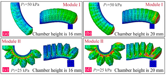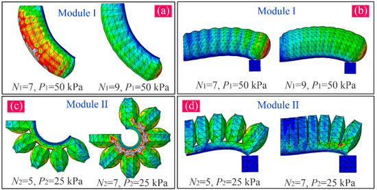 To investigate the impact that the chamber number has on the bending angle and output force, the FE models of the two PneuNet modules were built up in software. The pressure is defined on the internal surfaces of the chambers. The Young’s Modulus of the paper used in the inextensible layer is 6.5 Gpa, and the Poisson’s Ratio is 0.2. The proposed actuator is made of Dragon Skin 30 silicone rubber, which is widely used in soft PneuNets. According to the relevant literature, the material constant C10 is equal to 0.11, and C20 and C30 are both equal to 0.02 when the Yeoh hyperelastic model is used [34,36,37]. Furthermore, the contact interaction is defined between the inside walls of the adjacent chambers. For the convenience of the expression, the applied pressure of module I is labeled as and that of module II as . The chamber numbers of the two modules are labeled as and , respectively. During analysis, the height of the chamber was set at 22 mm, and and as 50 and 20 kPa, respectively. When varied from 7 to 10, and from 4 to 7, we observed the changes in the bending angle and output force. Figure 3a,b show the simulation results of the bending and tip force of module I when adopts 7 and 9, respectively. Figure 3c,d show the simulation results of the bending and tip force of module II when adopts 5 and 7, respectively.