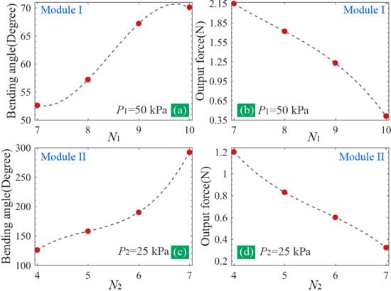 (a,b) The influence of the chamber number () on the bending angle and output force of module I and (c,d) the influence of the chamber number () on the bending angle and output force of module II.