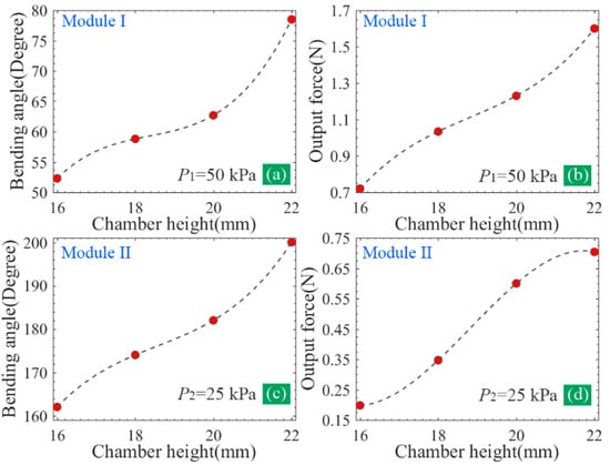 The variation of the bending angle and output force against the chamber height is shown in Figure 6. It can be concluded that both the bending angle and output force increase with an increased chamber height, indicating that enhancing the chamber height is conducive to the improvement of the bending and output force. Here, the chamber height of the soft actuator was determined as 22 mm. It should be noted that the influence that the chamber height has on the tip force of module II tends to be small (Figure 6d); therefore, a height of more than 22 mm was not considered. The geometric parameters of the proposed soft actuators labeled in Figure 1 are listed in Table 1.