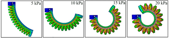 To compare the output properties of the traditional single FPN-based soft pneumatic actuator and the proposed one, a series of comparative FE simulations were performed. Before the comparison, an FE model for the conventional soft actuator was established. The two soft actuators adopted the same structural parameters, including total length, chamber number, height, and wall thickness. Considering that the maximum pressure that the two types of pneumatic networks can bear is different, the pressure applied to the traditional soft actuator and module II of the proposed actuator was limited to a range of 0–40 kPa, while that applied to module I of the proposed actuator was limited to a range of 0–80 kPa. As for why these pressure ranges were selected, we will answer that in Section 4. Figure 7 shows the bending of the traditional soft actuator at the pressures of 5, 10, 15, and 20 kPa.