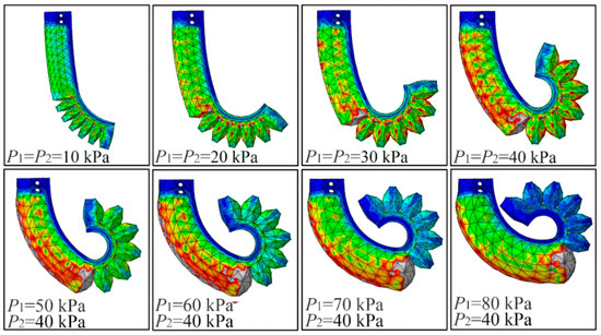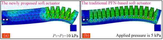 Figure 8 exhibits the bending deformation of the proposed soft actuator under different pressures. It should be noted that both modules adopted the same pressure () as the pressure was smaller than 40 kPa. When , remained unchanged at 40 kPa. The tip force of two kinds of soft actuators was also analyzed. Figure 9a,b show the FEA results of the traditional soft actuator under 5 kPa and the proposed actuator at 10 kPa (the two modules adopted the same pressure), respectively.
