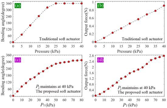 (a,b) The bending angle and output force of the traditional soft actuator under different pressures and (c,d) the bending angle and output force of the proposed soft actuator under different pressures.