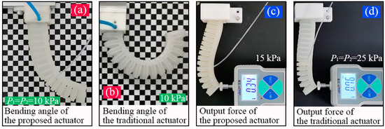 Measurement of the bending deformation and output force of two kinds of soft actuators: (a,b) bending deformation of the proposed soft actuator and the traditional one and (c,d) measuring of the output force of the proposed soft actuator and the traditional one.