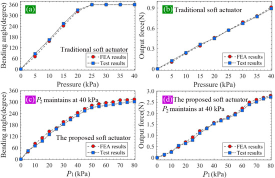 Figure 13b shows the variation of the output force (average of the five inflating trials) of the traditional soft actuator against the applied pressure, where the measured results are also compared with the FEA results (shown in Figure 10b). It can be seen that both tip force curves present a similar trend with the increase in pressure. The simulated results agree with the test results well. Figure 13d records the changes of the tip force against the pressure; similarly, the measured results are compared with the FEA results as shown in Figure 10d. It can be seen that the test and FEA results are approximately linear with the input pressure, presenting a good agreement with each other. When we compare the practically measured force data in Figure 13b,d, it can be seen, under the same pressure, that the tip force of the proposed actuator is notably greater than that of the traditional one. Within 0–40 kPa, the maximum tip force of the proposed actuator is 1.53 N, which increases by 70% relative to the maximum force (0.90 N) of the traditional one. When increases to 80 kPa, the output force will reach 2.73 N, which is 3.03 times that of the traditional soft actuator, showing a significant improvement.