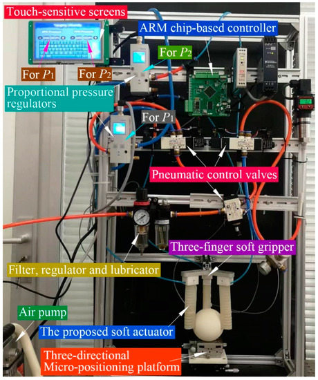 To test the grasping performance of the proposed soft actuator, a three-finger soft gripper was assembled, and an air control system was established which includes an air pump, an air treatment FRL (filter, regulator, and lubricator), several pneumatic control valves, and two proportional pressure regulators, as shown in Figure 14. To control the output pressures of the two proportional pressure regulators, a self-developed ARM microprocessor-based controller was used. Via the touch-sensitive screen of the controller, we could increase or decrease and manually to inflate the proposed soft actuators. During the grasping experiments, module I of the three soft actuators shared one proportional pressure regulator, while module II of these actuators shared another regulator, as indicated in Figure 14. Moreover, a three-directional micro-positioning platform was used to modulate the position of the object to be grasped.