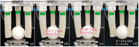 Figure 16 exhibits the primary stages of a PG example in which a smaller sphere was used. To realize the plane contact between the sphere and module II of the soft actuator, was kept at zero during the whole grasping process. When increased to 17.2 kPa, module II of the soft actuators could contact the sphere, as shown in Figure 16b. To produce a large enough pinching force, we continued to increase to 30.7 kPa, and the sphere was pinched gradually, as shown in Figure 16c. When increased to 34.6 kPa, we removed the platform and it could be seen that the gripper pinched the small sphere successfully, as Figure 16d shows.