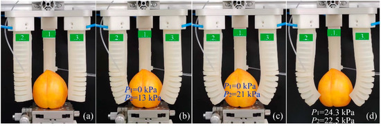 Another PG example is presented in Figure 17. In this example, a yellow peach was used and the grasping was realized by using the tips of the soft actuators. Within the grasping process, was adjusted first to make the actuator’s tip get in touch with the peach. Figure 17b shows the first contact of the soft actuator and the peach when kPa. With rising to 21 kPa, the peach was gradually pinched tightly by the actuator’s tips, as shown in Figure 17c. To make a larger tip force, and started to increase at the same time. As kPa and kPa, we removed the platform, and the peach was grasped stably by the gripper, as shown in Figure 17d. From the above examples, it can be seen the soft gripper constituted by the proposed soft actuator has good performance in both EG and PG. Since the proposed soft actuator adopts a composite structure of two kinds of pneumatic networks, it employs different output properties through different pressure combinations, presenting the expected flexibility and adaptability.