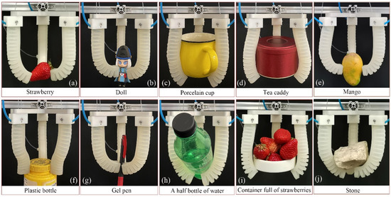 To further examine the grasping performance of the soft gripper, a series of objects with different shapes, sizes, and weights were used, as seen in Figure 18. During the experiments, if a grasp could remain stable for more than 60 s without dropping, it was defined as a successful grasp. It can be seen that the proposed soft gripper could grasp some small, irregular, and heavier objects in PG mode, such as a strawberry (Figure 18a), a doll (Figure 18b), a gel pen (Figure 18g), a mango (Figure 18e), and a plastic bottle (Figure 18f). It could also grasp heavier objects of a larger size in EG mode, such as a porcelain cup (Figure 18c) and a tea caddy (Figure 18d). The soft gripper could reliably grasp a 375g payload at a low input pressure ( kPa), such as half a bottle of water (Figure 18h). Moreover, it could also bear a stone with a quality of 447 g, as shown in Figure 18j. The grasping performance test results show that the new soft gripper constituted by the proposed soft actuators presents high reliability and stability whether in PG mode or EG mode, and it is competent for grasping objects with different shapes, sizes, and weights, demonstrating the feasibility and effectiveness of the newly proposed soft actuator.