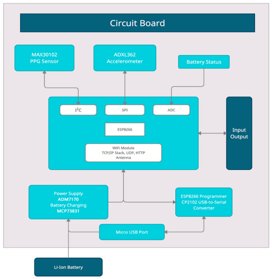- Sensing ComponentsTwo sensing components are integrated into the embedded device, an optical sensor, and an accelerometer. MAX30102 is a high-sensitivity optical sensor able to continuously obtain the PPG signal and it is mounted on the standalone MAXREFDES117# reference board [29]. This low-power sensor board with a size of 12.7 mm × 12.7 mm is placed on the downside of the device’s PCB. In addition, the main board of PCB incorporates the Analog Device’s ADXL362 sensor, which is an ultra-low-power, 3-DOF MEMS accelerometer with measurement ranges of ±2 g, ±4 g, and ±8 g [30].