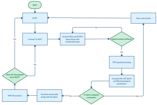 The device also has the capacity to locally store data in cases of dropped or lost Wi-Fi connection. ESP8266 module provides the user with a flash memory of 1 MB, from which the 0.4 MB are occupied by the device’s firmware. The remaining available memory is utilized for storing the measurements produced during the absence of network connection. The saved data are transmitted when the Wi-Fi connection is restored and then the device continues its regular operation. The device extracts the physiological parameters every 30 s and transmits them along with other data. As mentioned, the 30 s time period is a specification, which emerged during the trials, since within this time period, useful raw PPG signal is definitely included, facilitating the production of reliable physiological data values.