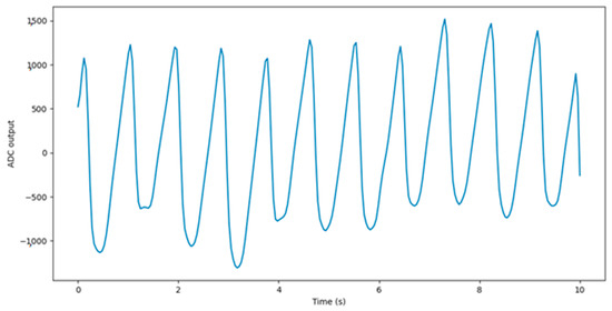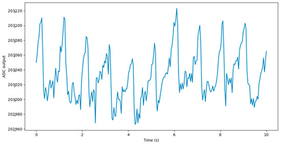The PPG signal consists of AC and DC components. The DC component corresponds to non-pulsatile tissue, while the AC component alternates according to the heart cycle. Only the variable part of the signal is relevant for HR and RR determination; thus, the mean value is usually subtracted from the signal used in the HR and RR measurement. The recorded raw PPG signal is shown in Figure 4.