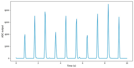 The implemented device, which is thoroughly described in [32], deploys an algorithm for the digital processing of the PPG signal in the time domain to remove the effect of MAs and the DC component. Given the fact that the appropriate to our analysis frequencies of the PPG signal are ranging from 0.1 to 5.0 Hz [33], an IIR Butterworth bandpass filter with a passband of [0.1, 5] Hz is applied prior to signal manipulation. The variable component of the signal after filtering is shown in Figure 5.