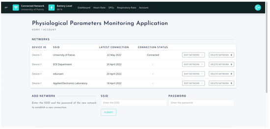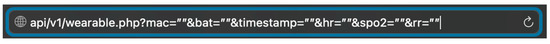 The wearable device transmits data to an API endpoint via Wi-Fi, implementing the HTTPS communication protocol which follows the HTTP protocol over a secure and encrypted connection. A time window of 30 s interposes between two data transmissions. A payload in URL encoded format is generated, which includes the values of physiological parameters collected by the wearable device; HR, SpO2, and RR. In addition, the payload includes the MAC address of the Wi-Fi’s Access Point (AP) and the battery level of the wearable device. The parameters of the payload are described in Table 3.