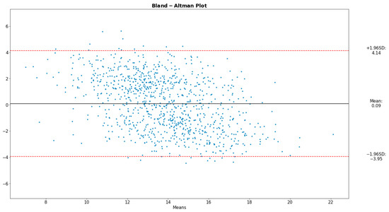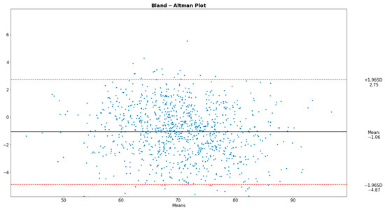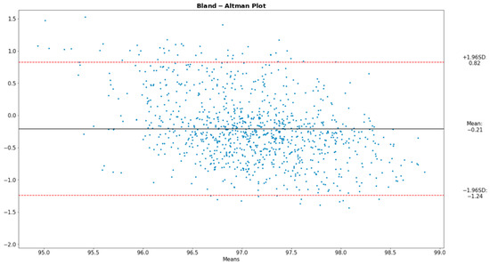 To analyze the alignment between the data acquired from our proposed device and those from the reference instruments, the Bland–Altman plot was deemed ideal. The Bland–Altman graph consists of a plot of the difference between paired readings of two variables, in our case the derived and the reference values, over the average of these readings. Incorporated into the plot are the ±1.96 SD lines (the Confidence Interval) parallel to the mean difference line.
