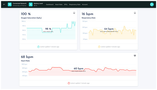 The dashboard, shown in Figure 11, is the core interface of the front-end, and serves as personalized analytics overview and real-time monitoring tool. The primary objective of the proposed dashboard relates to the visualization of the user’s latest measurements, captured by the wearable device, in an intuitive and user-friendly way. Therefore, it employs UI components, mainly embedded line charts within cards, to depict the trend of each physiological parameter over the last one hour. Charts establish an asynchronous connection with the database; thus, they are automatically updated in a real-time manner with the latest measurements recorded by the wearable device. The horizontal axis of each chart represents the time, whereas the vertical axis represents the captured values of the specific physiological parameter displayed. Below each chart stands a card footer which informs end-users for the time of the chart’s data latest update.