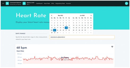 Another core component of the front-end is the horizontal navigation menu bar, placed at the UI’s header area. It comprises a minimal information area, which displays the connection status of the wearable device and the battery level, as well as a list that maps the analytics and account areas of the web-based application. Analytics areas (Figure 12) visualize historical data for the corresponding physiological parameter in a user-friendly way. In addition, they implement a data picker filter to allow end-users apply the desired time span of the displayed data.