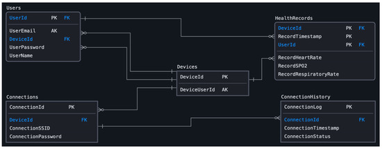 - The table of ‘HealthRecords’ stores information related to the physiological parameters. It has composite primary key (PK) which consists of the user identifier, wearable device identifier, and timestamp of the collected measurements. The attributes of user and wearable identifiers are foreign keys (FK) ‘Users’ and ‘Devices’, respectively. In addition, it includes attributes that represent all the physiological parameters collected by the wearable device, i.e., heart rate, SpO2, and respiratory rate.