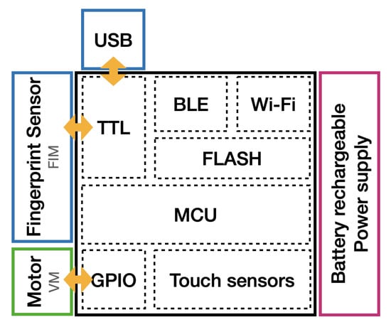 The fingerprint identification module (FIM) can autonomously collect fingerprint images and perform fingerprint enrollment, identification and verification functions. The FIM is connected to the MCU by the transistor–transistor logic (TTL) serial interface circuit. The MCU sends instructions to the FIM, which returns a reply package. A vibrating motor (VM) is connected to one general purpose input output (GPIO) port to reproduce a sequence of haptic feedback. Finally, five capacitive touch sensors detect when a finger touches the respective face of the cube.