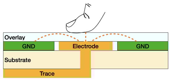 Figure 5 shows the schematic structure of an ideal touchpad. The finger and the copper pad represent the conductive parallel plate of a capacitor separated by a dielectric medium, the overlay.