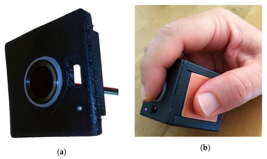 Although the design of the prototype allowed convenient manipulations by different-sized hands, insertion into a pocket was not as nimble. Thus, a new smaller pocket-sized device was made, eliminating the FIM module. Its dimensions of 38 mm × 34 mm × 34 mm enabled the desired results (Figure 12). The main difficulty in miniaturization has been met by battery size. Although a smaller device results in a handier device and better touch sensing, due to the shortening of circuit trace, a very small battery could require frequent charging, which could negatively affect the usability.