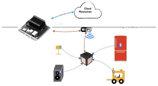 The TactCube communicates with the AmI by Wi-Fi connectivity and sends the AmI the manipulation sequences and the proximity data about other BLE devices. The latter allow the AmI to achieve a more precise user’s location. Indeed, using the principles of “inquiry” and “inquiry scan”, as specified in the Bluetooth core specification [], a BLE client application can discover services offered by other BLE server devices in its proximity. In the proposed case, the TactCube is programmed to be a BLE client that, discovering the devices in proximity, identifies them and estimates which is the nearest by evaluating the received signal strength indicator (RSSI) of each of them. Figure 8 depicts the architecture, where the BLE protocol detects the devices in proximity of the TactCube, and the Wi-Fi connects the TactCube with the AI of the AmI.