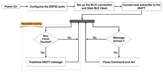 The NodeMCU programming model is asynchronous and event-driven. Then, without any real-time operating system (RTOS), it was possible to develop a firmware for the TactCube that communicates asynchronously and has real-time reactions to the user manipulations. Figure 9 shows a summarized workflow of the whole firmware.