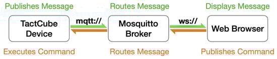 MQTT is designed as an extremely lightweight publish/subscribe messaging transport. It is an OASIS Standard [] providing a reliable client/server messaging transport protocol suitable for communication in M2M/IoT contexts wherever a small code footprint is required, such as for the proposed TactCube hardware. MQTT supports two-way messaging, deterministic message delivery, basic QoS levels, always/almost connected scenarios, loose coupling and scalability to accommodate large numbers of devices as well. Based on the client/server paradigm, the MQTT server side is an application that acts as broker among the clients that can publish and subscribe to specific topics or a group of them. Each message is associated to a topic (sometimes defined as a channel), and the MQTT broker routes the published messages to all the clients that subscribed to its topic. Whenever a client publishes a message on a topic, all clients subscribed to that topic will receive it in an asynchronous way as soon the connection with the broker is available. As transport protocol, the MQTT protocol uses the Internet protocols (IP), such as the transmission control protocol (TCP/IP) or the user datagram protocol (UDP).