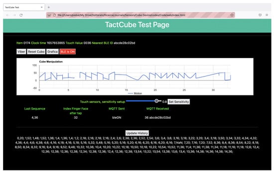 The procedure to test the TactCube device has been as follows. The tester’s PC and the TactCube device were connected to the same MQTT broker through the same Wi-Fi network. The tester opened the Web application tool and sent an initial reset command to the TactCube. The reset command initialized the touch sensors of the device. During this initialization, the TactCube must be left untouched to set the zero values of sensors. It is the offset to compare with values read during the manipulations to understand whether a face is touched or not. To signal the end of the calibration phase, the TactCube generated a brief vibration. After that, the TactCube can be used.
