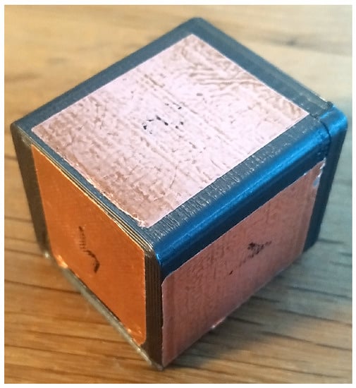 Two strategies were used for the prototype of touch pads. Initially, five square printed circuit boards were placed on each of the five faces of the cube with an FR4 fiberglass substrate and a single side copper layer. The last prototype, on the other hand, used an adhesive copper sheet glued directly onto the polylactide (PLA) faces of the cube. Both solutions used a conformal silicone as a coating, which is a very thin dielectric medium. The two solutions did not show any appreciable difference on tactile performance, but the second solution allowed for a reduction in the size of the cube, decreasing the thickness of each face by about 1.5 mm.