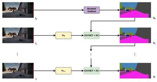 For key frame segmentation, we use the SN-R18 and BN-R18 models, based on the SwiftNet-R18 [18] and BiSeNet [19] networks, and GSVNET as a propagation framework. GSVNET starts with a spatio-temporal estimation on downscaled segmentation obtained from the aforementioned models. is the segmentation from previous frame . To arrive at an initial estimate for the current frame , GSVNET performs temporal wrapping on based on optical flow, as expressed in Equation (1):