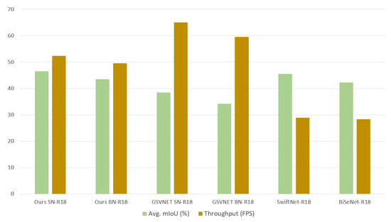 Comparison of accuracy-throughput performance using our dataset on our end hardware, NVIDIA Jetson TX1. Our models, exclusive of the pre-trained GSVNET SN-R18 or BN-R18 and SwiftNet-R18 or BiSeNet-R18, are trained and validated with our dataset.